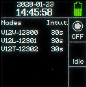 Number of nodes, battery level. Select Datalogger status in the Menu.
